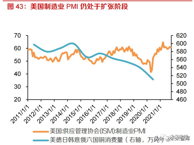 其他国家 2021 年前 7 个月铜需求尚未恢复至 2019 年水平,或随着船运的缓解和疫苗的推广继续回升。其他国家铜消费可以分两类来看,首先是美日韩德意俄六个主要经济体,铜消费 2021 年 1-7 月精炼铜消费量达 304 万吨,略低于 2019 年 311 万吨水平,从美国最新公布的 10 月制造业PMI 数据来看,该指标为 60.8,尽管不及 61.1 的前值,但仍处于扩张阶段,主要经济体对铜的消费在今年下半年或继续回升。除中国及前述六个经济体以外的国家 2016-2019 年消费量在 575-585万吨,在 2020 年仅为 520 万吨,由于经济的复苏慢于发达国家,2021 年 1-7 月较 2019 年同期仍有 5.4%的降幅,预计在 22 年或恢复至正常区间水平。