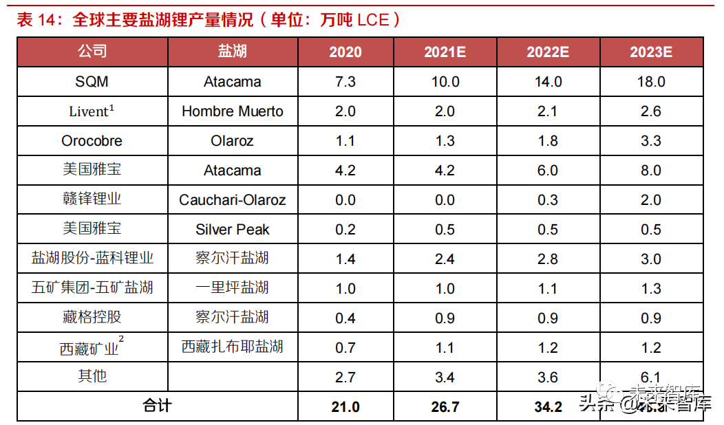 2.2.1 盐湖:21-23 年产量或达 27、34、47 万吨 LCE,同比增速或达28%、28%、37%
