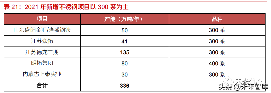 从牌号上看,由于新增不锈钢产能以 300 系为主,预计 2021-2023 年 300 系不锈钢占比持续提升。根据 ISSF 协会统计,200 系不锈钢在我国民营不锈钢新建产能的崛起下,自 2011 年的 17.1%占比,提升至 2019 年 24.8%,2020 年下滑至 22.9%,300 系维持在 53-55%区间范围内,400 系部不锈钢持续下降。尽管 200 系价格相对便宜,但由于不锈钢耐腐蚀性能较弱,在我国走向高质量发展的道路上,预计 200 系不锈钢占比提升的形势将会发生扭转。从 2021 年我国新增的不锈钢产能计划上看,300 系不锈钢产能占比达 76.2%,而 200 系不锈钢没有明显增量。因此我们假设2021-2023 年全球 200 系不锈钢占比分别为 21.4%、20.0%和 18.6%,300 系不锈钢占比分别为56.1%、57.6%、59.1%,400 系不锈钢占比分别为 22.5%、22.4%和 22.3%。