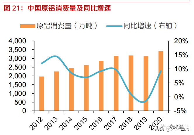 包装用铝将保持平稳增速,成为新的需求亮点。随着人民消费水平的提高,包装用铝的需求近年来保持了较高增速。2020 年我生产包装铝箔 215 万吨,铝易拉罐罐料 155 万吨,同比增速分别达到7.5%和 6.9%,在我国铝消费中的合计占比接近 11%。预计未来两年仍将保持平稳增速,成为拉动铝需求的亮点之一。