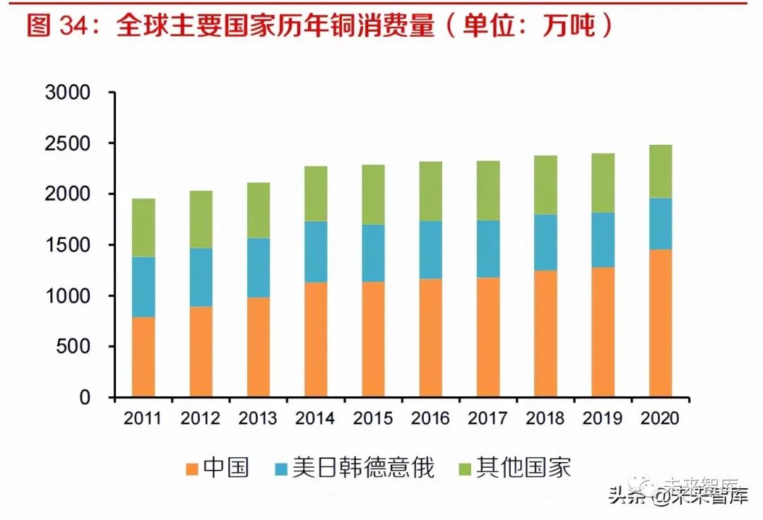 受中国需求拉动,20 年精炼铜消费不降反增,2021 年 1-7 月全球精炼铜消费基本持平。根据智利国家铜业委员会和 ICSG 统计,2020 年全球精炼铜消费量达 2483.2 万吨,同比增长 3.4%,铜消费量不减反增主要受中国需求的拉动。2020 年中国精炼铜消费量达 1452.7 万吨,占全球消费量比例达 58.5%,较 2019 年大幅提升 5.2PCT。其他国家精炼铜消费量则出现明显收缩,2020 年下滑8.0%至 1030.4 万吨。2021 年 1-7 月全球精炼铜消费同比增加 0.7%,达 1423.9 万吨。
