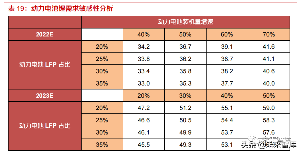 锂基本面主要取决于动力电池装机增速,以及 LFP 和三元电池占比结构,若动力电池装机 22 年增超 60%,锂价景气有望持续。动力电池装机增速以及 LFP 占比对 22-23 年动力电池锂需求量进行了敏感性分析,其中基准情形为 22-23 动力电池装机增速 64%、38%,LFP 占比 31%、28%。