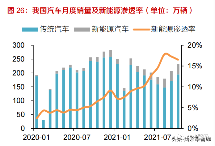 新能源汽车渗透率提升,汽车用铝或为最大的需求增长点。2021 年以来,我国汽车产量同比增速开始回升,根据东方证券汽车组统计我国 2021 年乘用车的销量同比增速约为 5%,其中新能源乘用车销量迎来爆发式增长,2021 年下半年,新能源汽车在汽车总销量中的占比已经提升至 16%-18%,2021 年 Q1-Q3 国内新能源乘用车销量同比增速逾 100%。而新能源汽车单车的用铝量相比传统汽车几乎高出了一倍,将会有更多的铝材应用到汽车上。