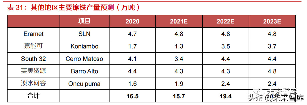其他地区镍铁主要位于新喀、巴西等红土镍矿资源丰富国家,增量主要来自嘉能可位于新喀的Koniambo 镍铁项目,2021 年受维修期超期,产量有所削减,预计 22 年产量将由 21 年的 1.3 万吨提升至 3.5 万吨。