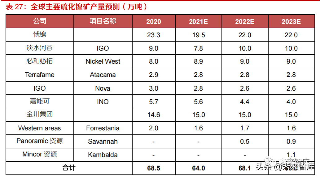 预计 2021-2023 年全球硫化镍为硫化镍矿总产量(以金属镍计)分别为 64.0、68.1、69.0 万吨,呈慢速增长态势。2020 年硫化镍矿总产量达约 68.5 万吨,占全球镍供给 27.2%。根据各公司公告,2021 年俄镍、淡水河谷、必和必拓生产运营均出现扰动,预计 2021 年产量下滑至 64 万吨。22-23 年产量增量一是主要来源于前述企业恢复正常生产,二是来源于小型硫化矿的建成投产,如Panoramic 资源公司位于澳大利亚的 Savannah 硫化镍矿,设计产能约 0.9 万吨金属镍,预计 21年 8 月投产;Mincor 资源的 Kambalda 项目设计产能约 1.6 万吨,原计划 22 年投产,目前推迟到预计 23 年投产。