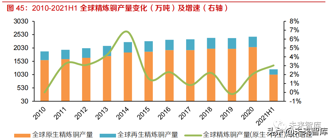 2020 年全球精炼铜产量增幅 2.1%达 2451 万吨,矿产铜产量进入刚性放量阶段。根据 ICGS 统计,2020 年全球精炼铜产量同比提升 2.1%达 2451 万吨,其中原生精炼铜占比 84%达 2063.5 万吨,根据 Wood Mackenzie 统计,尽管 2020 年新冠疫情对矿产铜干扰率高达 2.9%,但受第一量子、自由港、OZ 矿业等旗下大型项目开始逐渐放量,2020 年原生精炼铜产量实际与 2019 年相差无几,而再生铜出现 3.8%的下滑。2021 年上半年全球精炼铜产量同比提升 3.0%达 1229.6 万吨,原生、再生精炼铜同比分别提升 2.8%和 4.4%。